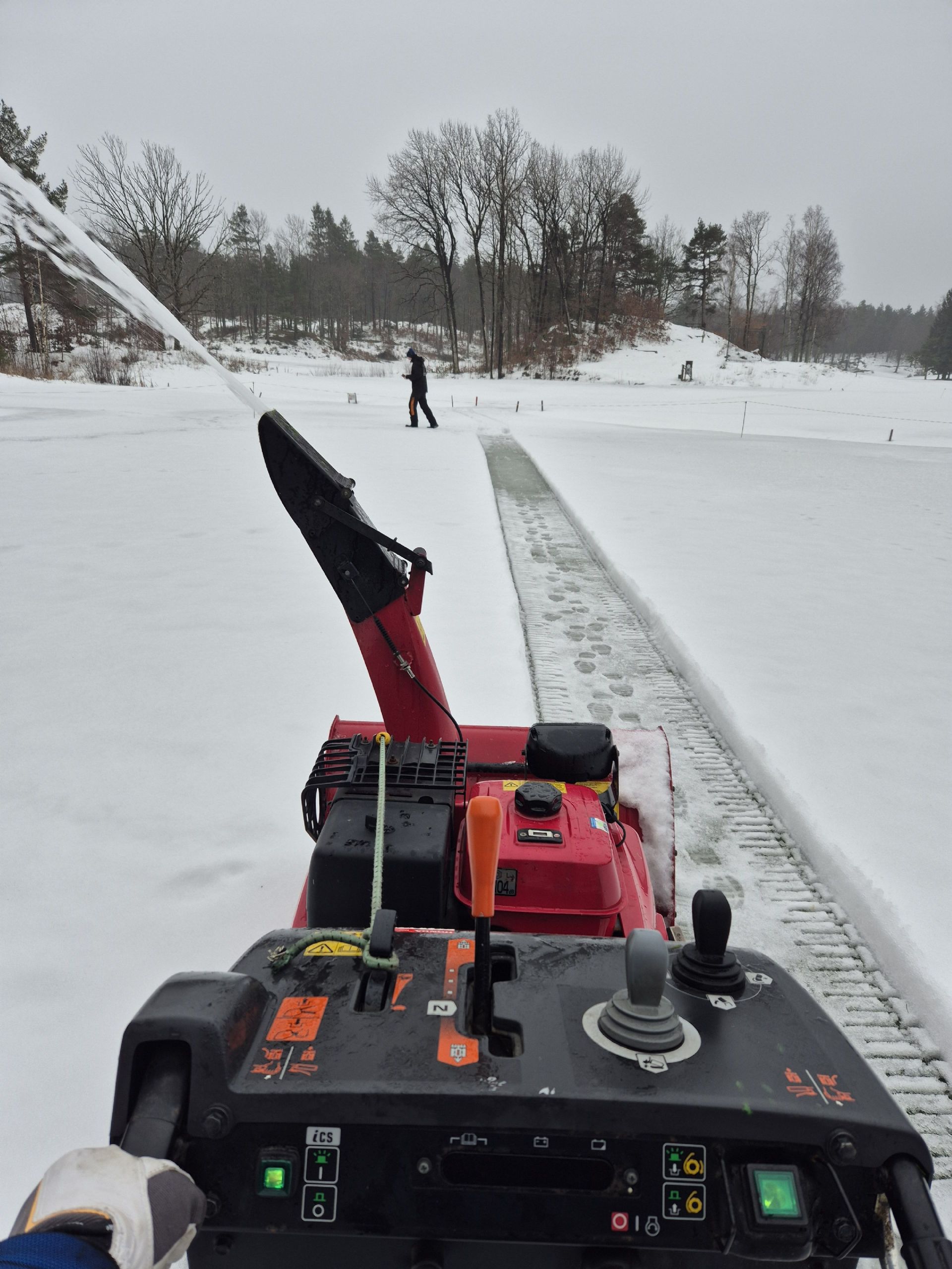 Etter hvert som temperaturen begynte å krype litt oppover, fikk vi perioder med smelting etterfulgt av ny frost. Dette førte til at det dannet seg is på noen av greenene, og da var det på tide å finne frem snøfreseren. Vi fjernet snø fra greenene for å hjelpe solen og mildværet med å smelte isen raskere.